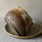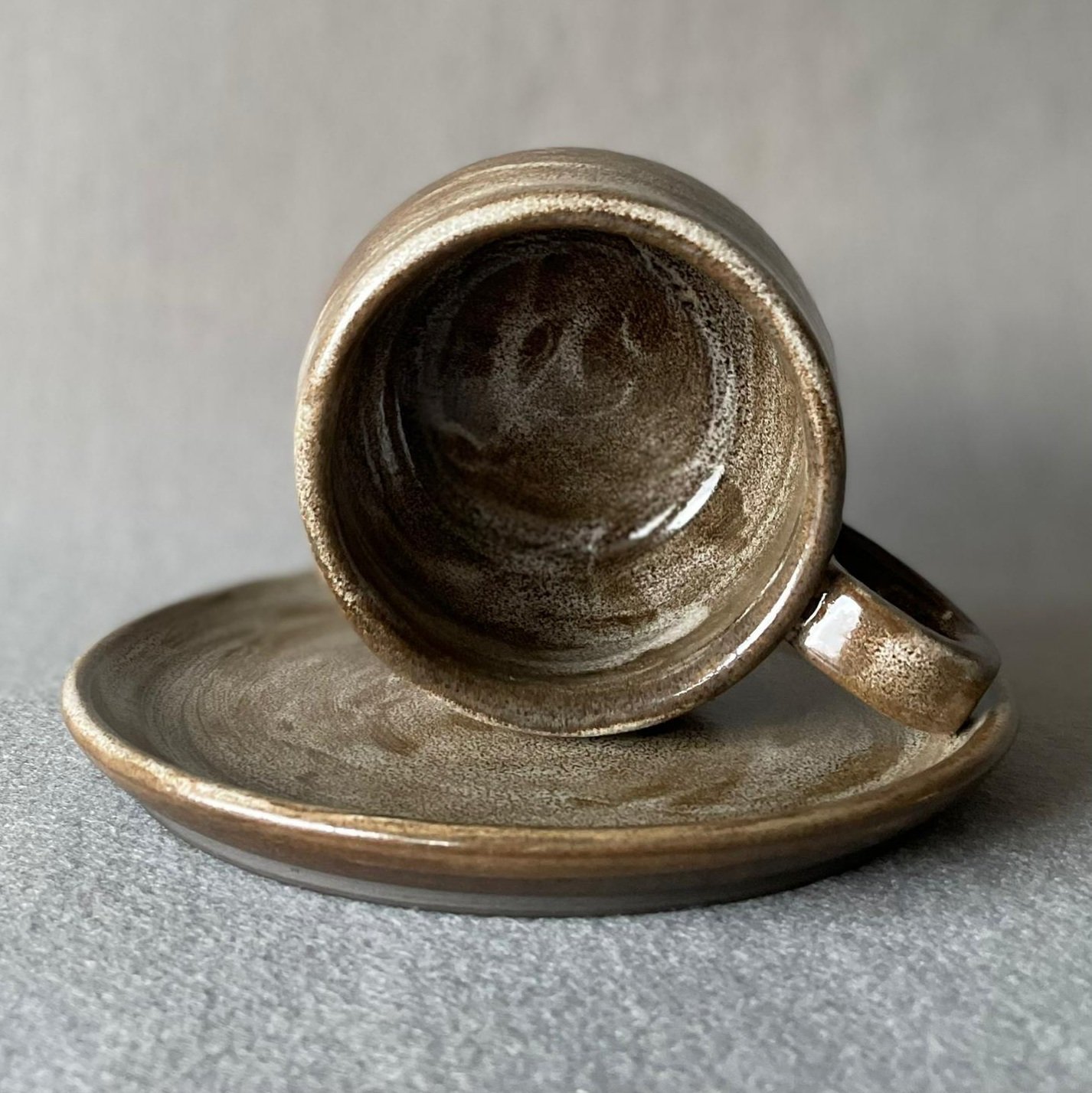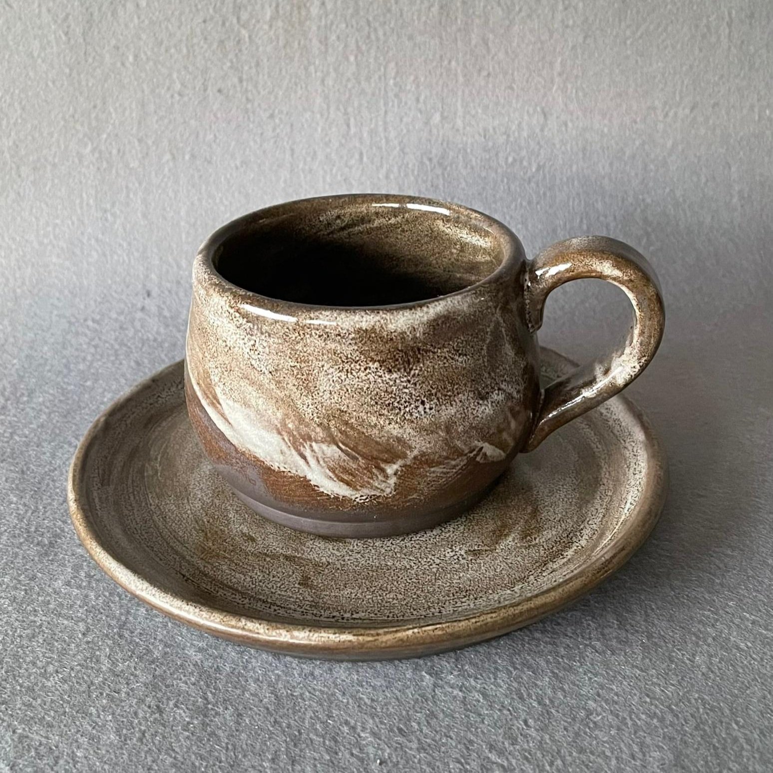 A wheel-thrown and hand-finished, one of a kind, cup and tea plate set made from velvety black clay and with a unique mix of coffee cremé coloured glazes.
